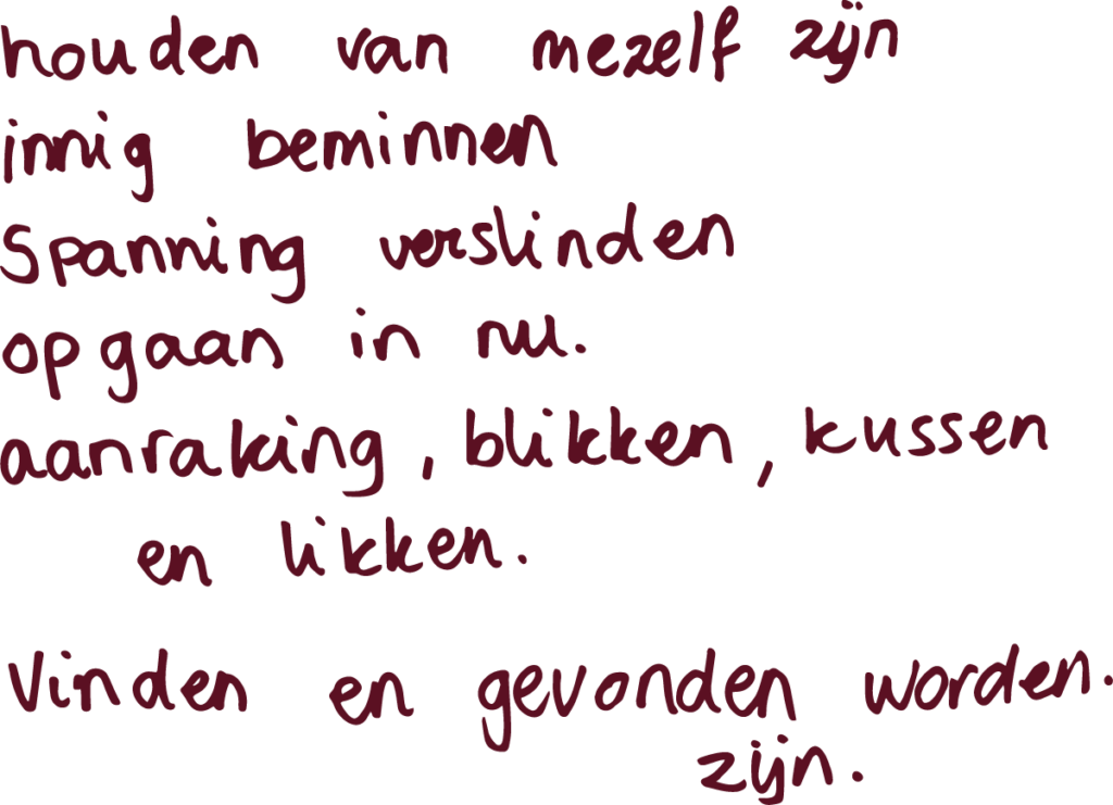 [R]: Vrijer dan ooit. Eigenlijk op alle vlakken vrijer dan ooit. Dus van hoe ik seks in de praktijk breng samen met Tijn, met mezelf tot en met gender. Dat laatste heeft alles en ook niets te maken met seksualiteit, maar daar voel ik me ook vrijer in dan ooit. Ik voel die vrijheid ook in de rol van speeltjes in mijn en ons seksleven tot en met de rollen die wij durven aan te nemen daarbinnen. En dat gewoon te laten zijn.